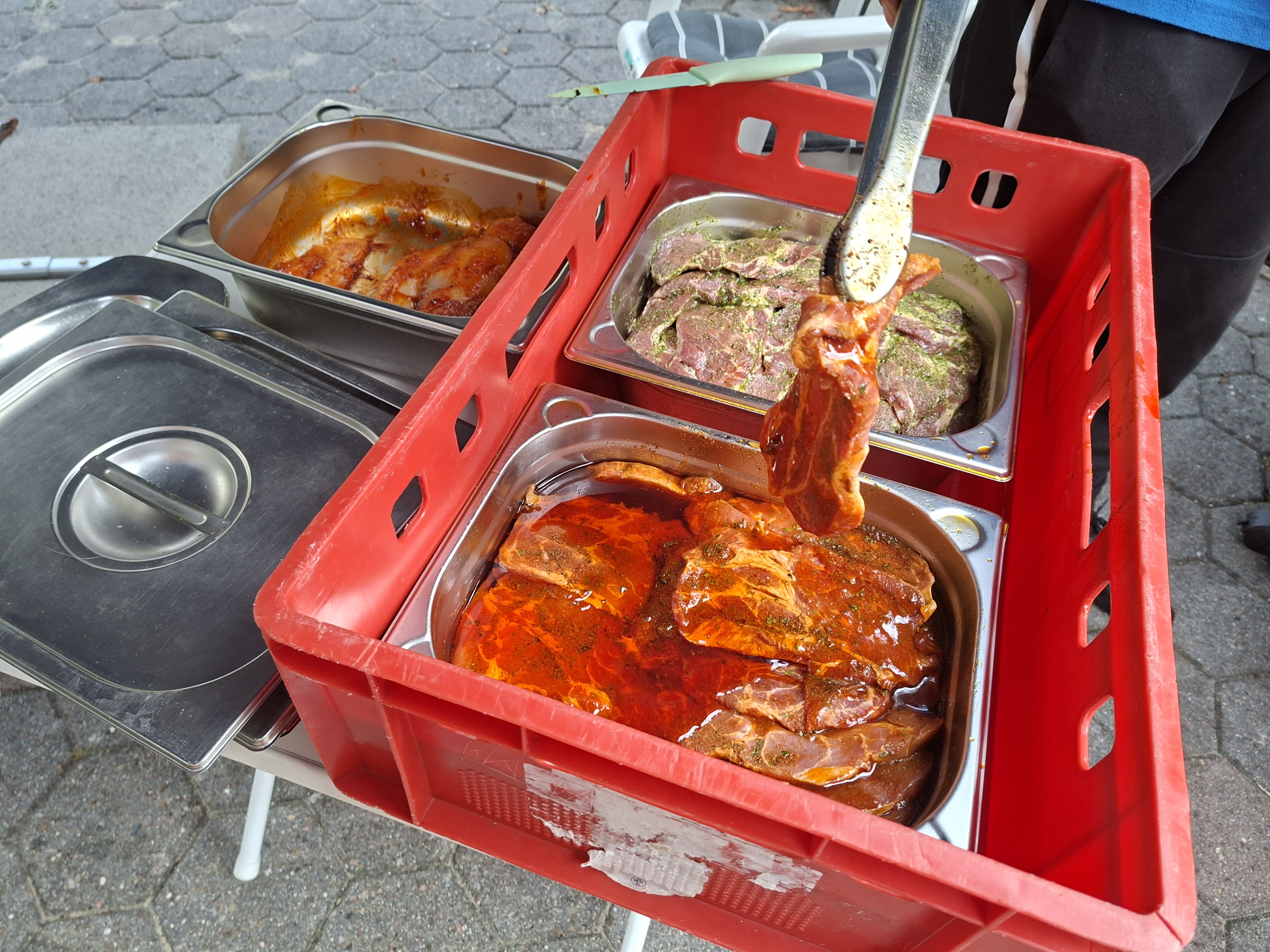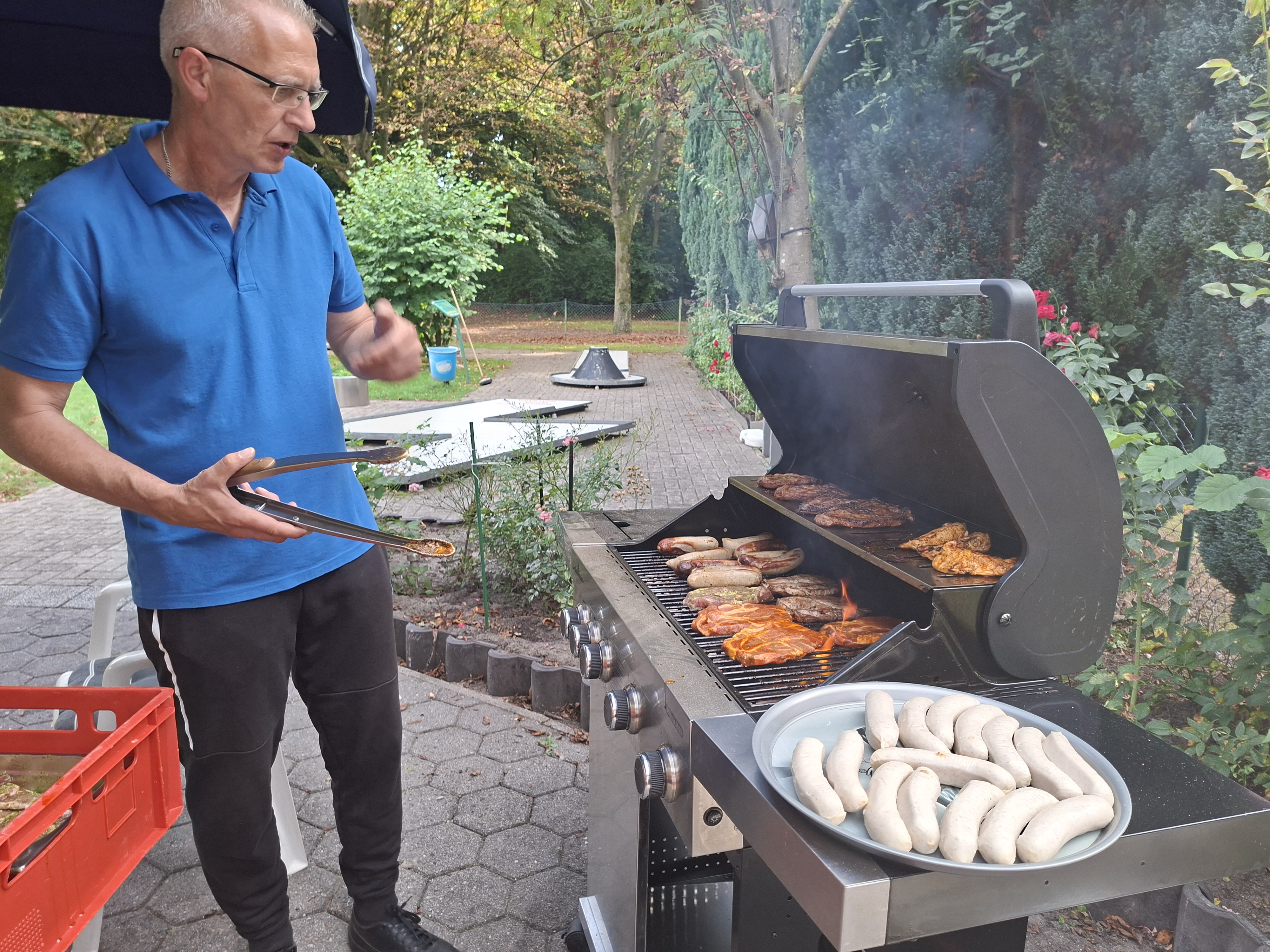 Danach ging das Schlemmen los! Viele Salate, Tsatsiki, Saucen, Brot etc. waren von den Aktiven mitgebracht worden und der Verein stellte unterschiedliche Fleischsorten zum Grillen zur Verfügung. Unser Grillmeister, wie immer, Reiner.