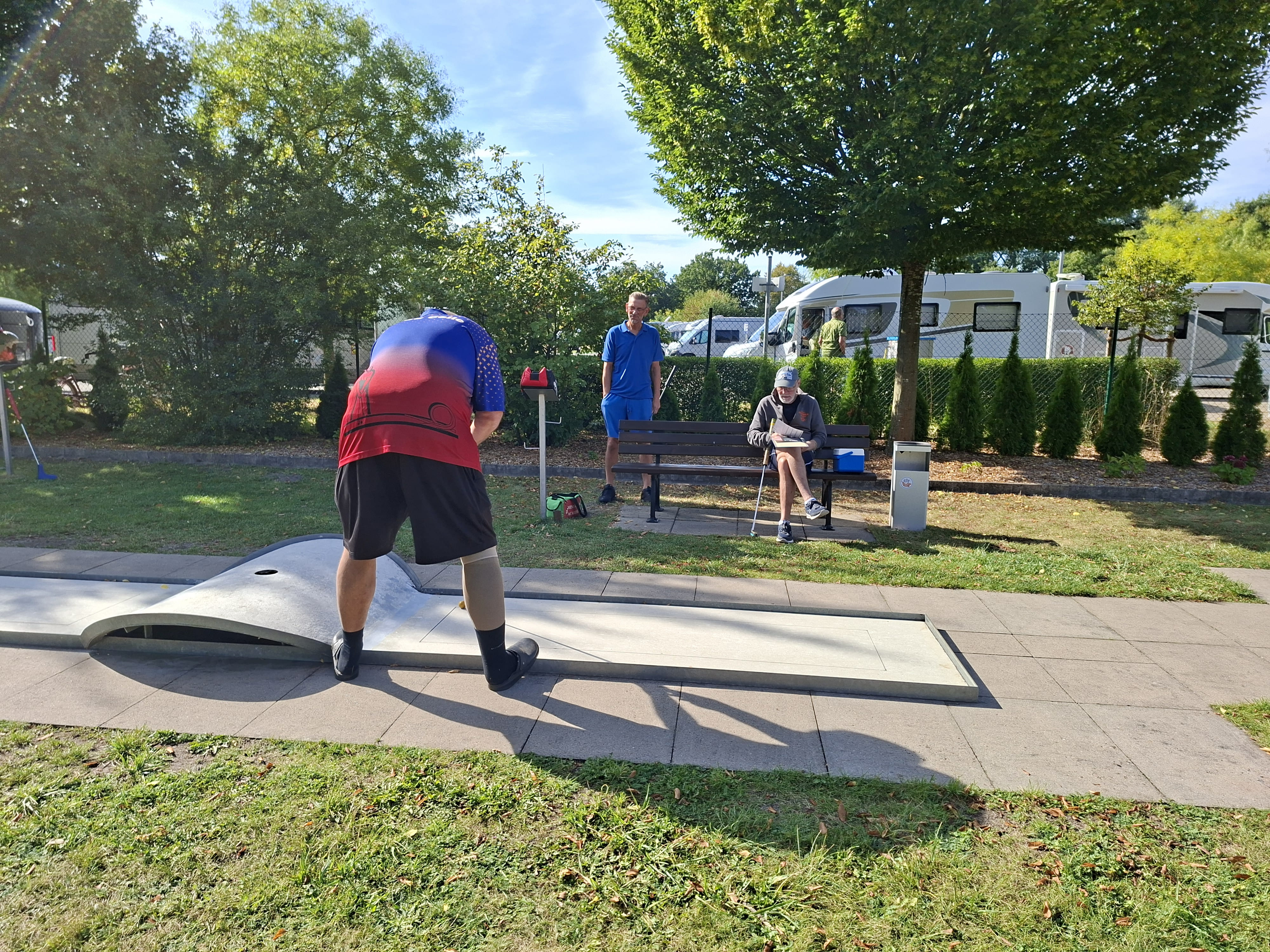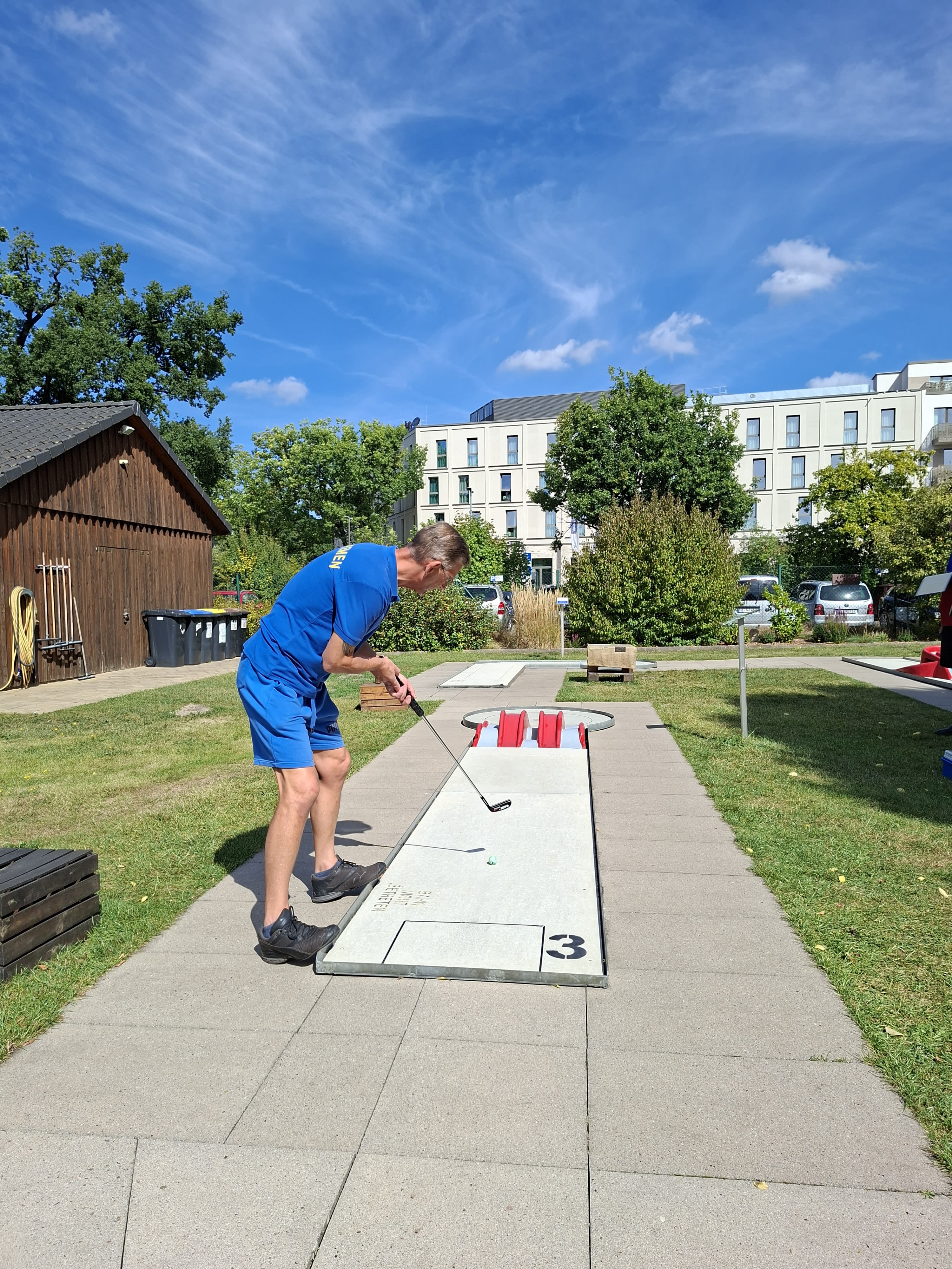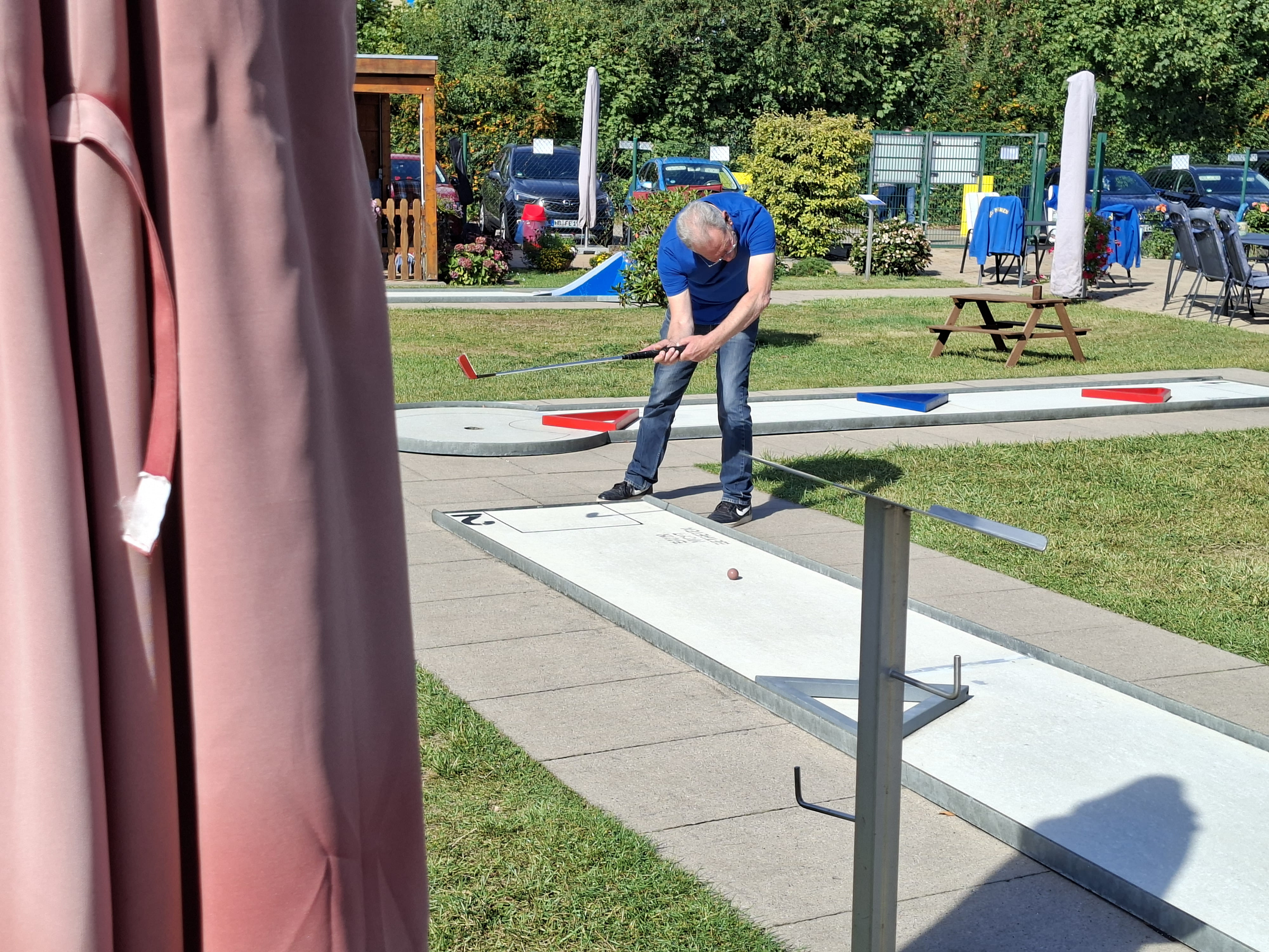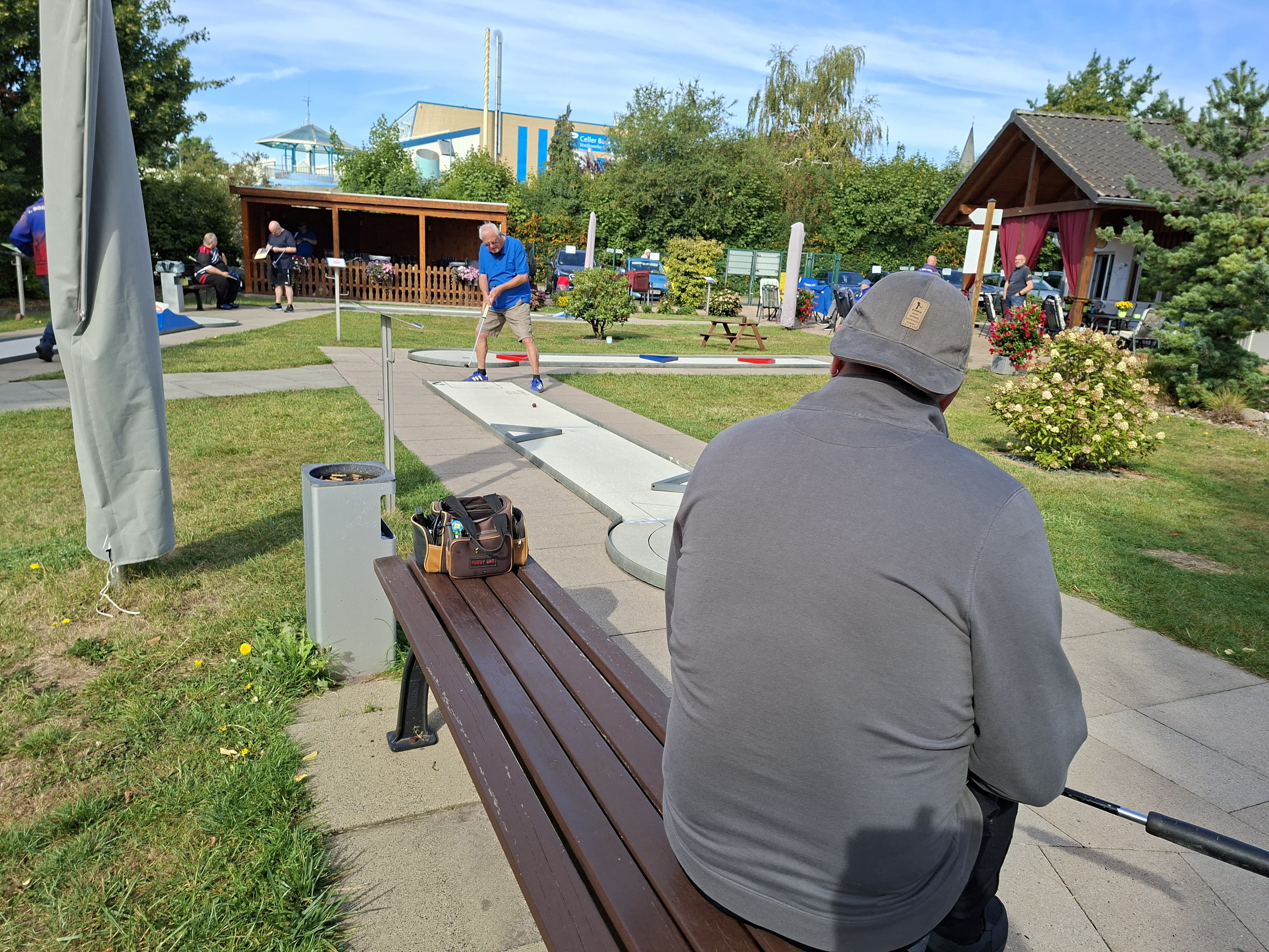 Das gibt neue Energie für die beiden letzten Runden. Voller Adrenalin zaubert Benny ebenfalls eine 20 auf das Protokoll. Matthias spielt eine 22 und Andy ist mit einer 24 einigermaßen zufrieden. Die beiden roten Ergebnisse von Thomas und Ralf werden schnell vergessen bzw. gestrichen.